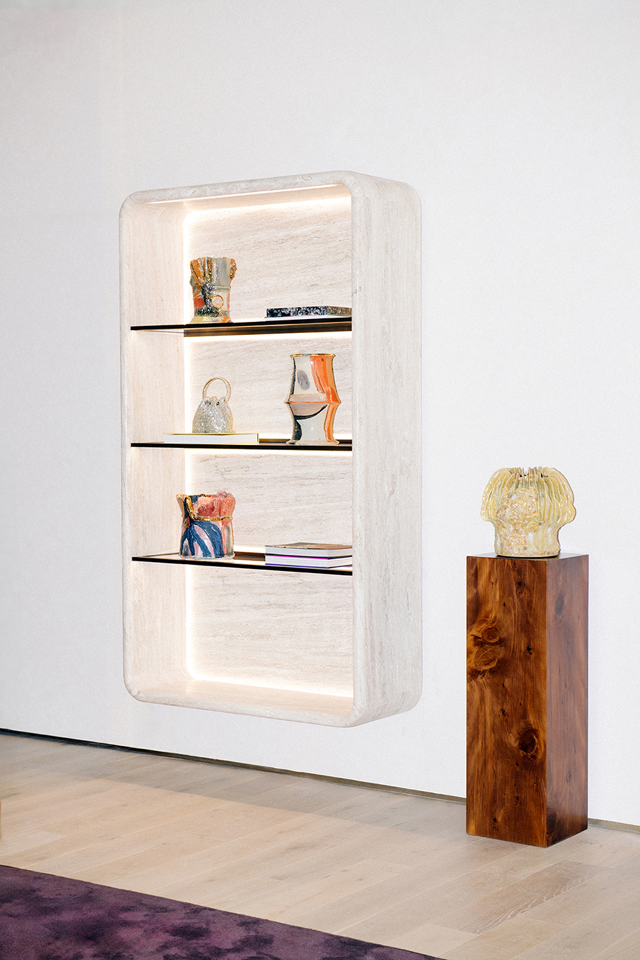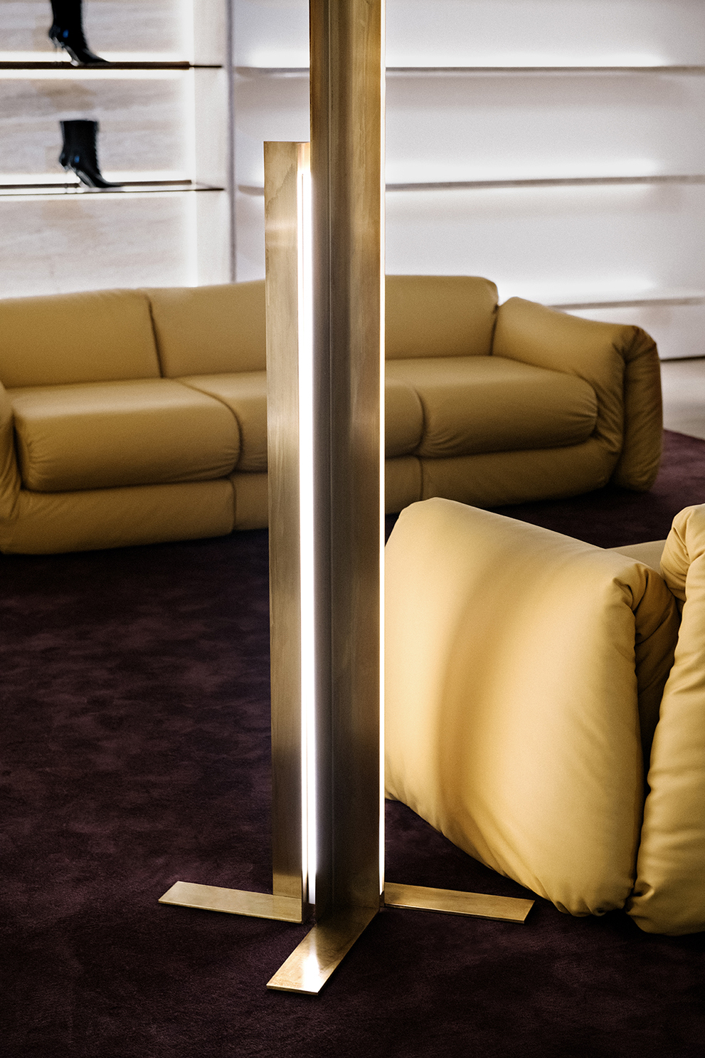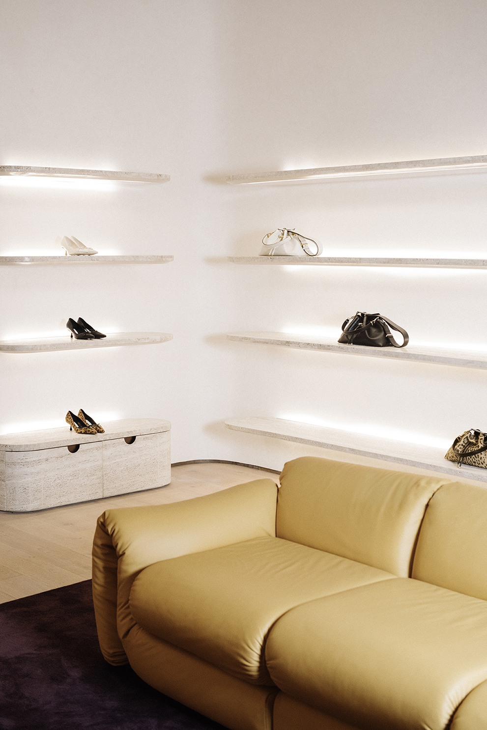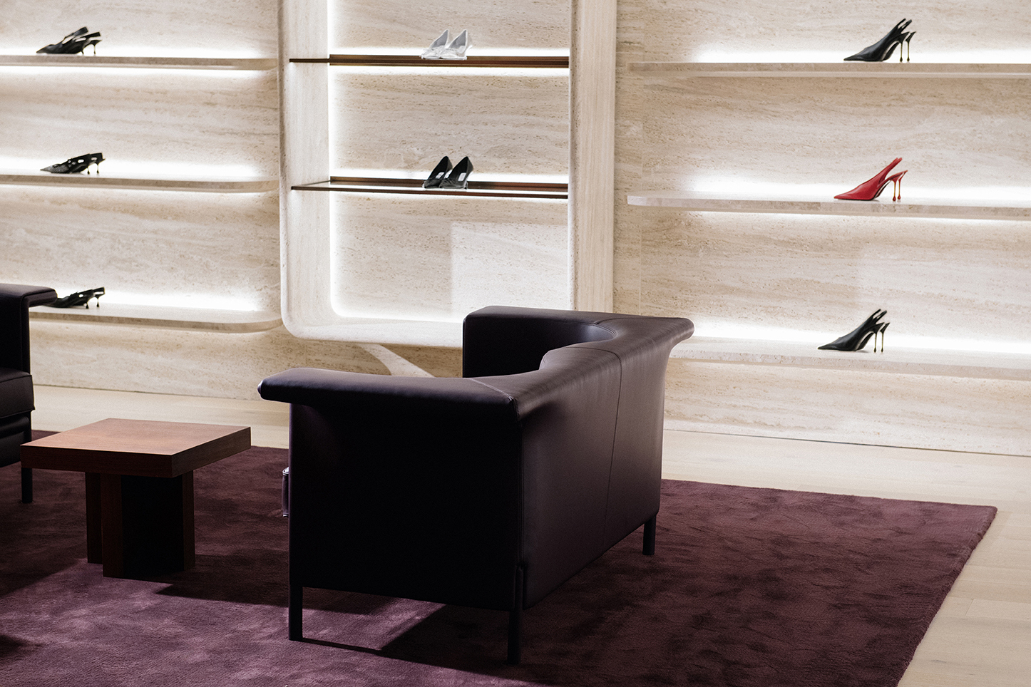 For Jimmy Choo’s Madison Avenue flagship, Nilufar contributed to shaping the boutique’s refined interior, integrating mid-century furniture, curated lighting, and luxurious materials such as walnut, travertine, and velvet. The design creates intimate, jewel-box–like spaces where the brand’s iconic shoes and accessories are showcased, blending contemporary elegance with a sense of timeless sophistication.